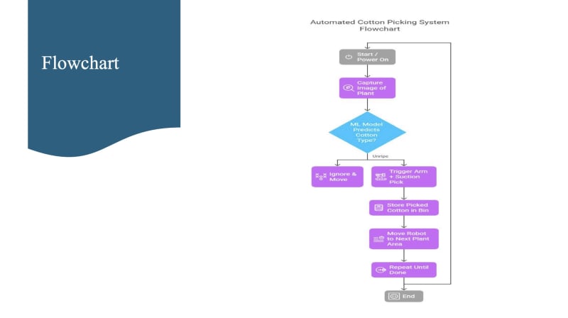 To address these multifaceted issues, there is a clear and urgent need for a solution that can automate cotton picking in a selective and cost-effective manner. This project—Smart Cotton-Picking Robot—proposes an innovative robotic solution using machine learning (ML), computer vision, and a suction-based mechanism to intelligently identify and harvest mature cotton. It aims to reduce dependency on manual labor, ensure consistency in quality, and increase operational efficiency, paving the way for the future of smart agriculture.