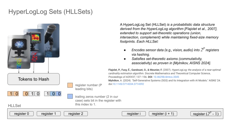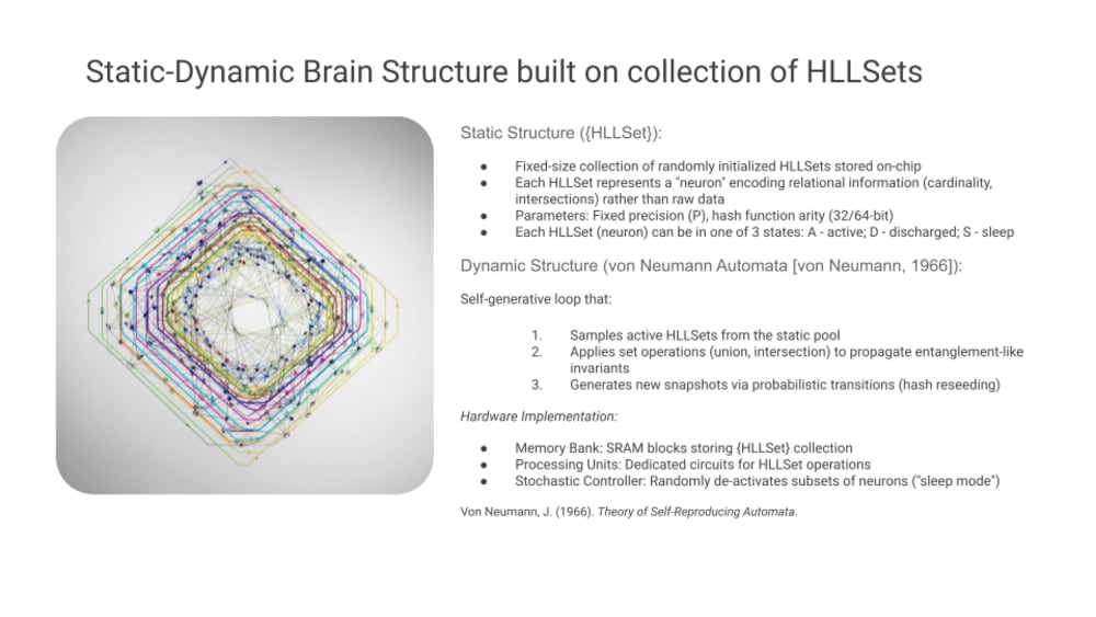 - A static-dynamic brain structure combining HyperLogLog probabilistic sets (HLLSets) as neurons with von Neumann automata for self-generation