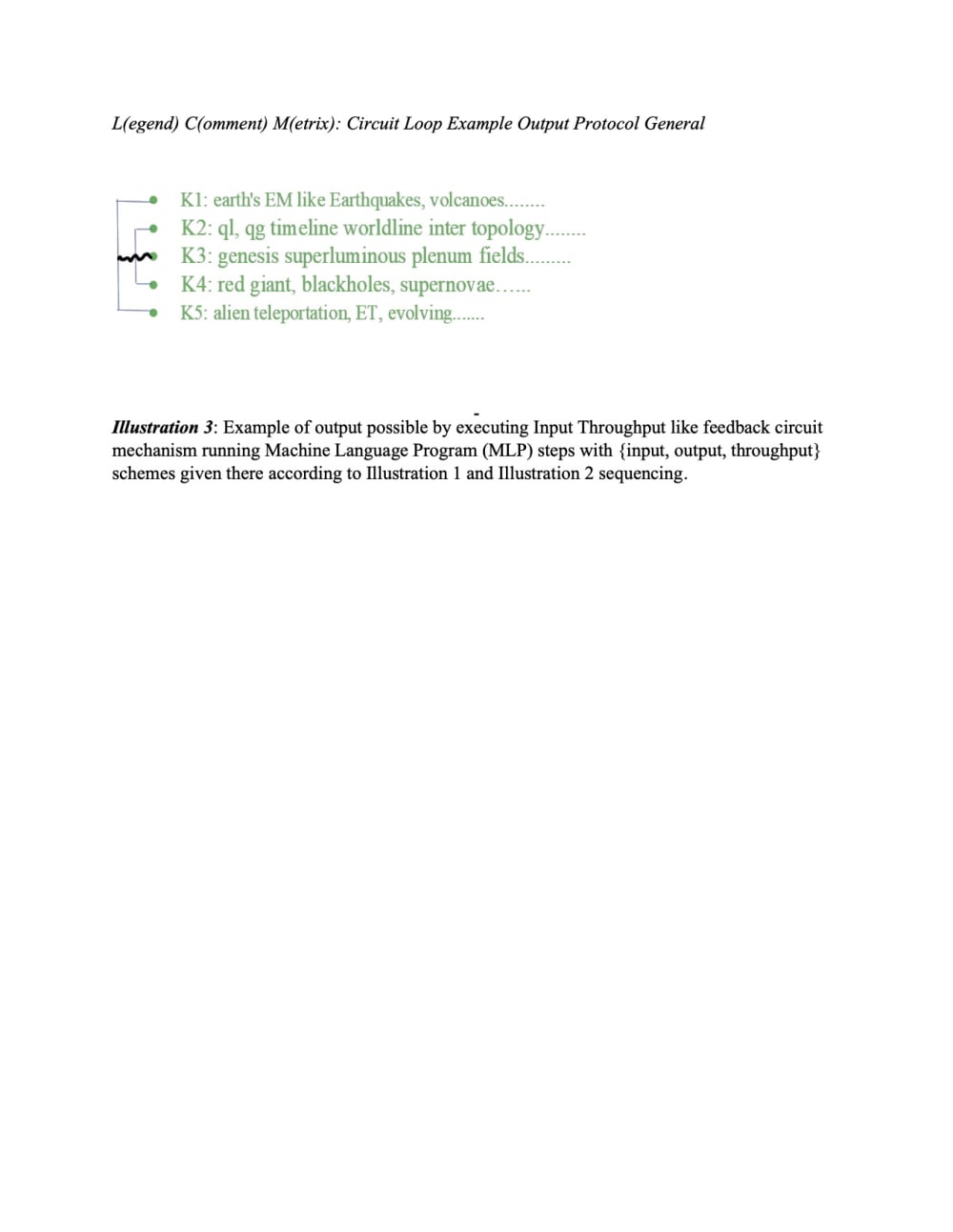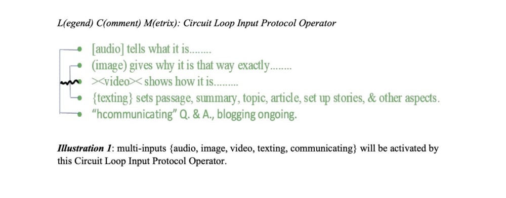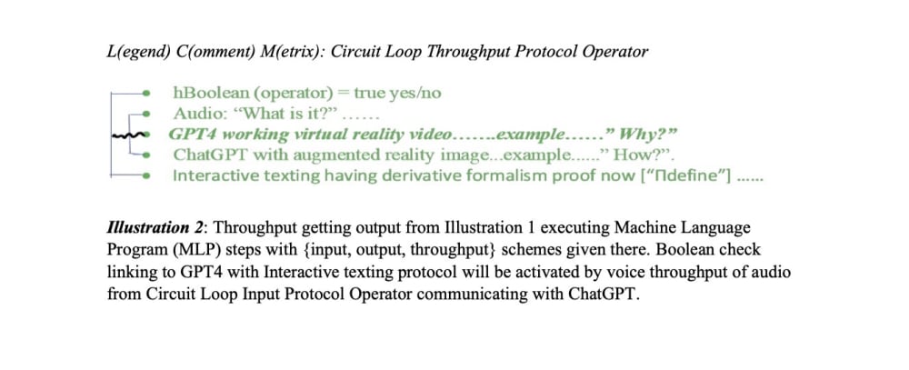 Within Illustration 1, multi-inputs {audio, image, video, texting, communicating} will be activated by Circuit Loop Input Protocol Operator. Illustration 2 shows throughput getting output from Illustration 1 executing Machine Language Program (MLP) steps with {input, output, throughput} schemes given there. Boolean check linking to GPT4 with Interactive texting protocol will be activated by voice throughput of audio from Circuit Loop Input Protocol Operator communicating with ChatGPT. Illustration 3 is exemplifying possible output results seamlessly executing Input Throughput like feedback circuit mechanism running Machine Language Program (MLP) steps with {input, output, throughput} schemes given in video describing the processing Illustration 1 and Illustration 2 sequencing syntactical program concept.