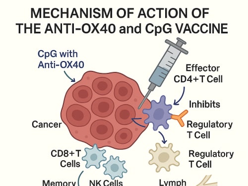 This project describes the development of a novel cancer immunotherapy vaccine designed to cure tumoral cancers in dogs. This vaccine is unique since the dog must have cancer for it to work. The vaccine employs a combination of an agonist anti-OX40 monoclonal antibody and a CpG oligodeoxynucleotide (ODN), delivered intratumorally.
