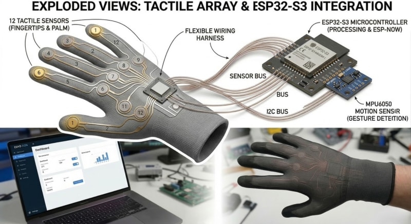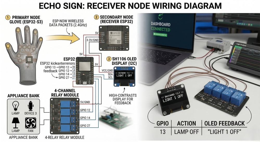 ECHO SIGN is a distributed node system built on the ESP32 ecosystem. The Primary Node (the glove) utilizes a tactile array of 12 sensors integrated into the fingertips and palm to map specific physiological or emergency needs, such as "I need water" or "I am in pain". An ESP32-S3 microcontroller processes these tactile inputs and transmits data packets via the ESP-NOW protocol, chosen for its high speed and low latency. Simultaneously, an MPU6050 motion sensor detects hand gestures. A Secondary Node receives these signals to trigger a 4-channel relay bank for home automation—allowing users to control appliances like lights and fans by tilting their hand plus or minus 30 degrees. A Flask-based web dashboard provides caregivers with real-time monitoring, message history, and live video feeds.