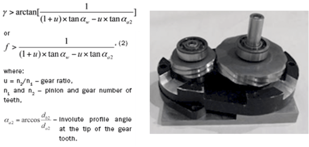 Option 2: The point P is placed between the point B1, where the outer diameter of the pinion intersects the line contact and the center of the gear O2. This type of gear can be self-locking with relatively high driving efficiency, above 50%. Another condition of self-locking is to have a sufficient friction angle gama to deflect the force F’ beyond the center of the pinion O1. It creates a resisting self-locking torque T’1 = F’ x L’1, where L’1 is a lever of the force F’1. This condition can be presented as L’1min > 0 (see Figure 2). The analytical and finite element analysis of this design has been validated and proved relatively high efficiency and reliable self-locking (Figure 3). The self-locking can have symmetric or asymmetric tooth profile depending on the load signature and application. It has a great potential in various industries such as in automotive, aerospace, medical, robotic, agricultural, textile, and food industries. Further detail information can be found in AGMA and Gear Solutions publication.