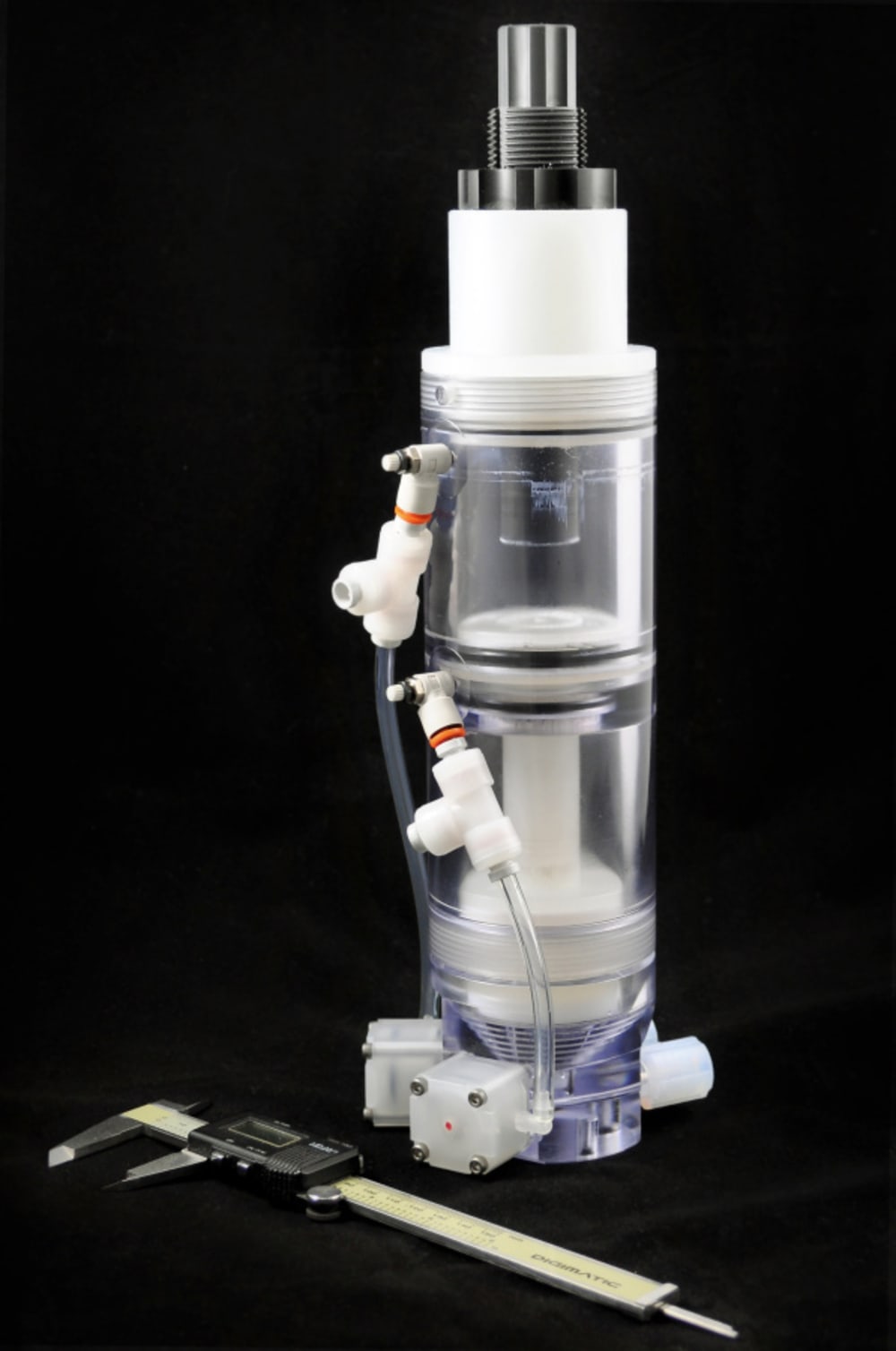 The pump that is being developed and tested overcomes these limitations. The patented design utilizes “rolling diaphragm” technology. The rolling diaphragm is supported between a cylindrical bore and internal support/actuator and is made from high purity PTFE. The fully supported nature of the design results in a high degree of stability in the structure which translates to a very accurate and repeatable volumetric dispense. Since the rolling diaphragm has no dynamic sealing surfaces there is no possibility of bypass (leakage). The lack of a dynamic seal and 100% PTFE flow path eliminates the possibility of particle generation and ionic contamination critical to sensitive industries such as semiconductor.