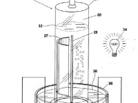 Figure 5 is a simplified concept example (no gas separation) in which the cathode (#27), the anode (#28), the water is made conductive by addition of a salt such as sodium sulfate. The cathode is formed from a thin sheet of copper coated with electro-deposited nickel to form a light absorbent coating or “black” on the side facing the anode and light source. Other materials are possible. Figures 3 and 4 illustrate a more practical embodiment shown in cross-section in Figure 3 and frontal view in Figure 4. In these illustrations #42 indicates the anode wires, #48 is the cathode sheet, #44 the transparent barrier between the electrodes and #40 a transparent covering facing the light source.